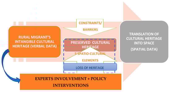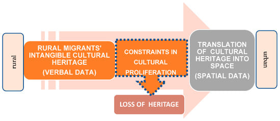 The constraints hampering the process of cultural proliferation into spatial manifestation can limit the translation of cultural heritage into place, leading to loss of heritage and sustainability practices. Figure 6 describes how the intangible cultural heritage of the rural–urban migrants is expressed through the spatial construct of the informal settlements. The inhabitants of the informal settlements play the role of culture carriers, bringing intangible cultural heritage built around sustainability values from their ancestorial villages into the city. This heritage is translated into the spatial realm in the manifestation of informal settlements. However, where the translation of intangible culture into tangible spatial/physical fabric faces constraints, a loss of regional heritage and traditional practices supporting valuable sustainability concepts and practices occurs.