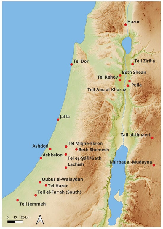 - Killebrew, A.E. The World of the Philistines and Other “Sea Peoples”. In Assyria to Iberia Art and Culture in the Iron Age; Aruz, J., Seymour, M., Eds.; Metropolitan Museum of Art: New York, NY, USA, 2016; pp. 30–39. [Google Scholar]