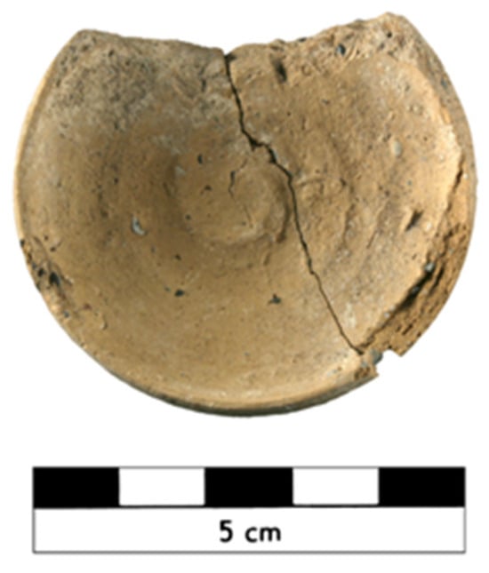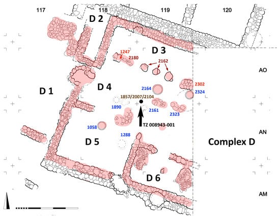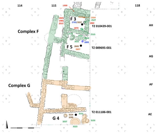 In Room F 5, adjacent to and south of Room F 3, dog bone TZ 009695-001 (scapula; Table 13) was found. Within the room were found several pits that may also have been silos (Pits 2528, 2620, 2621, and 2660), as well as an oven (Tabun 2099). Finds within the pits indicate a crafting area. Among the finds were a rubbing plate, several rubbing stones, two stone bowls, a weight and two querns, a fragment of a melting pot made of limestone, two flint objects, metal fragments and raw material remains, a ceramic funnel, and tabun fragments.