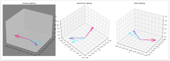 Gaze direction of the male (pink) and female’s eyes (light blue and blue) by OpenAI, ChatGPT-4 (accessed on 12 October 2024) via Python coding. This calculation was made on the basis of the 3D model of the sarcophagus. The arrows indicate the gaze direction of each eye for the male and female figures. Each arrow’s orientation (i.e., the direction it points to) shows where each eye is directed to in 3D space relative to the sarcophagus. The length of each vector represents the magnitude of the gaze, showing the relative focus distance.