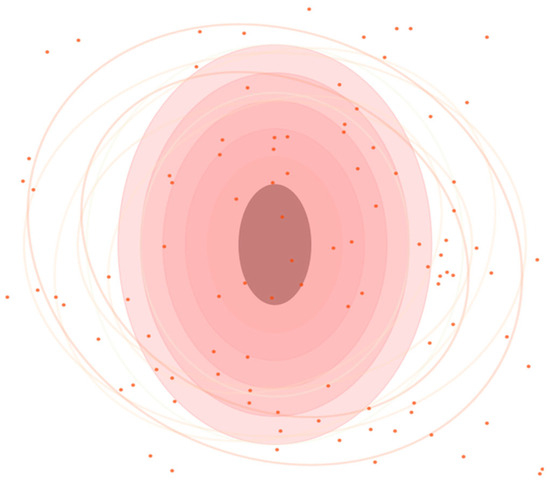 The “aura” of the sarcophagus is depicted with varying degrees of visual attention. The sarcophagus (darker oval) in the center of the funerary chamber is simulated by this AI visual reconstruction (OpenAI, ChatGPT-4 (accessed on 12 October 2024)) based on the intensity of visual interaction. The red dots concern the sounds and acoustic engagement during funerary rituals.