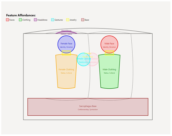 The chart emphasizes both individual features (faces, headdresses) and shared elements (pose, decorative features), reflecting the dual nature of the sarcophagus as.