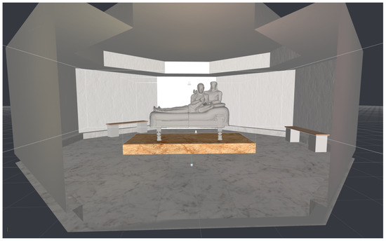 The case study concerns an iconic and important masterpiece of Etruscan funerary art from about 530-510 BCE: the Sarcophagus of the Spouses [13,14,15], which is currently on display at the National Etruscan Museum of Villa Giulia in Rome. The artifact is displayed in a separate section of the museum to provide visitors with enough space for a full visual experience from any spatial perspective [16]. The original archeological discovery of this artifact [17] does not allow for a precise identification of its location: it is mentioned in old reports as the eastern necropolis of Cerveteri (“scavi Boccanera”, 1874, 1877, 1881 [18]), but the exact topography is unknown [18]. However, it is possible to reconstruct approximately the original context: the sarcophagus was placed inside a funerary chamber in a tufa-block tomb similar to other cases in Cerveteri and in Etruria [15,19].