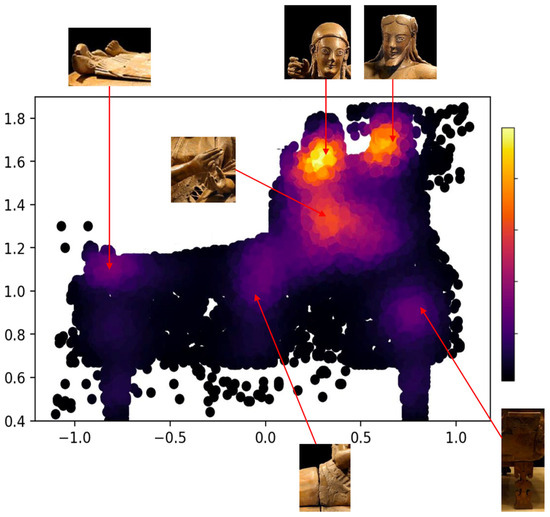A more articulated and comprehensive analysis of the eye tracking considers heat maps, saccades, fixations, and scanning paths. The largest concentration of eye-tracking points appears to be on the central part of the sarcophagus, where the two figures of the spouses are located (Figure 9). This suggests that viewers are primarily interested in the human figures, which are often the focal point of such artifacts. There are smaller clusters of focus around the edges and specific details, likely corresponding to the hands, faces, and, possibly, the decorative elements on the sarcophagus. The top portion of the sarcophagus attracts some attention, which may indicate viewers’ interest in the facial features or headgear of the figures.