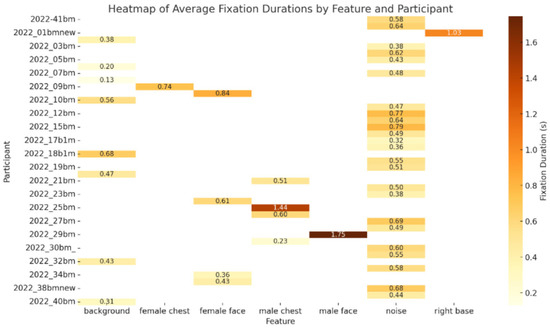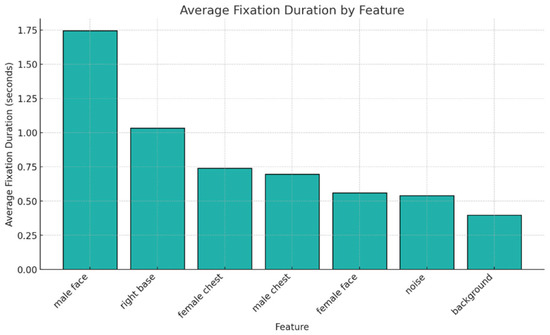 Time spent on each feature (OpenAI, ChatGPT-4 (accessed on 12 October 2024) Python coding). The key features are the male chest, male face, female chest, and female hands. A shorter attention span is observed for male hands. Background and noise are also quite evident in this chart.
