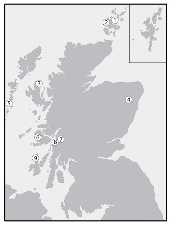 Locations of sites providing the food source δ13C and δ15N data presented in Table 5. 1. Braes of Ha’Breck; 2. Skara Brae; 3. An Corran; 4. Balbridie; 5. Bornish; 6. Ulva Cave; 7. Aird’s Bay, Loch Etive; 8. Carding Mill Bay and Raschoille, Oban; 9. Caisteal-nan-Gillean and Cnoc Coig, Oronsay.
