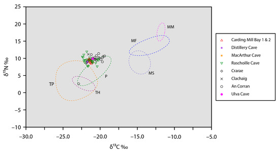 Bulk collagen stable carbon and nitrogen isotope data for Neolithic humans from nine sites in western Scotland compared against the ranges of stable isotope values (represented by ellipsoid hulls) for major food groups (see Table 5): MF—marine fish; MM—marine mammals; MS—marine shellfish; P—pigs; TH—terrestrial herbivores; TP—terrestrial plants.