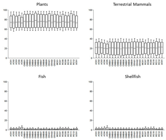 FRUITS dietary models for Neolithic individuals from western Scotland grouped by food source. The solid line represents the median estimated food source contribution to dietary calories, the dotted line shows the mean estimated contribution, the box shows the 68% credible interval (CI); and the whiskers the 95% CI.