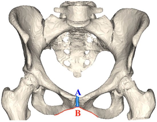 Human female pelvis displaying the two structures examined in this research: (A) Pubic symphysis (blue shaded) and (B) pubic arch (red line).