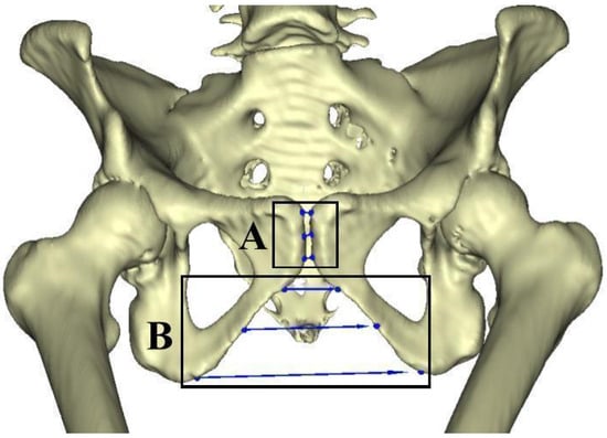 (A) Pelvis model with the superior, middle, and inferior measurements for the pubic symphysis noted (box A). (B) Pelvis model with the superior, middle, and inferior measurements of the pubic arch noted (box B).