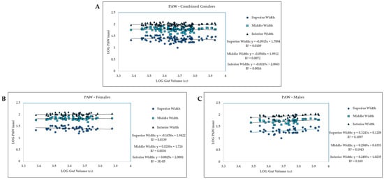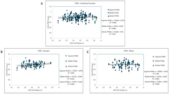 For pubic arch width, LOG Gut Volume vs LOG width for superior width, middle width, and inferior width measurements. (A) Combined gender group. (B) Females. (C) Males.