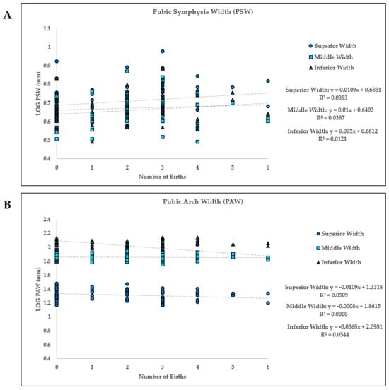 Linear regression between the number of births (parity) and the pubic symphysis width (PSW) and pubic arch width (PAW) at each of the three measurements (superior width (SW), middle width (MW), and inferior width (IW)). (A) PSW: Parity vs. LOG width three measurements, (B) PAW: Parity vs. LOG width for three measurements.