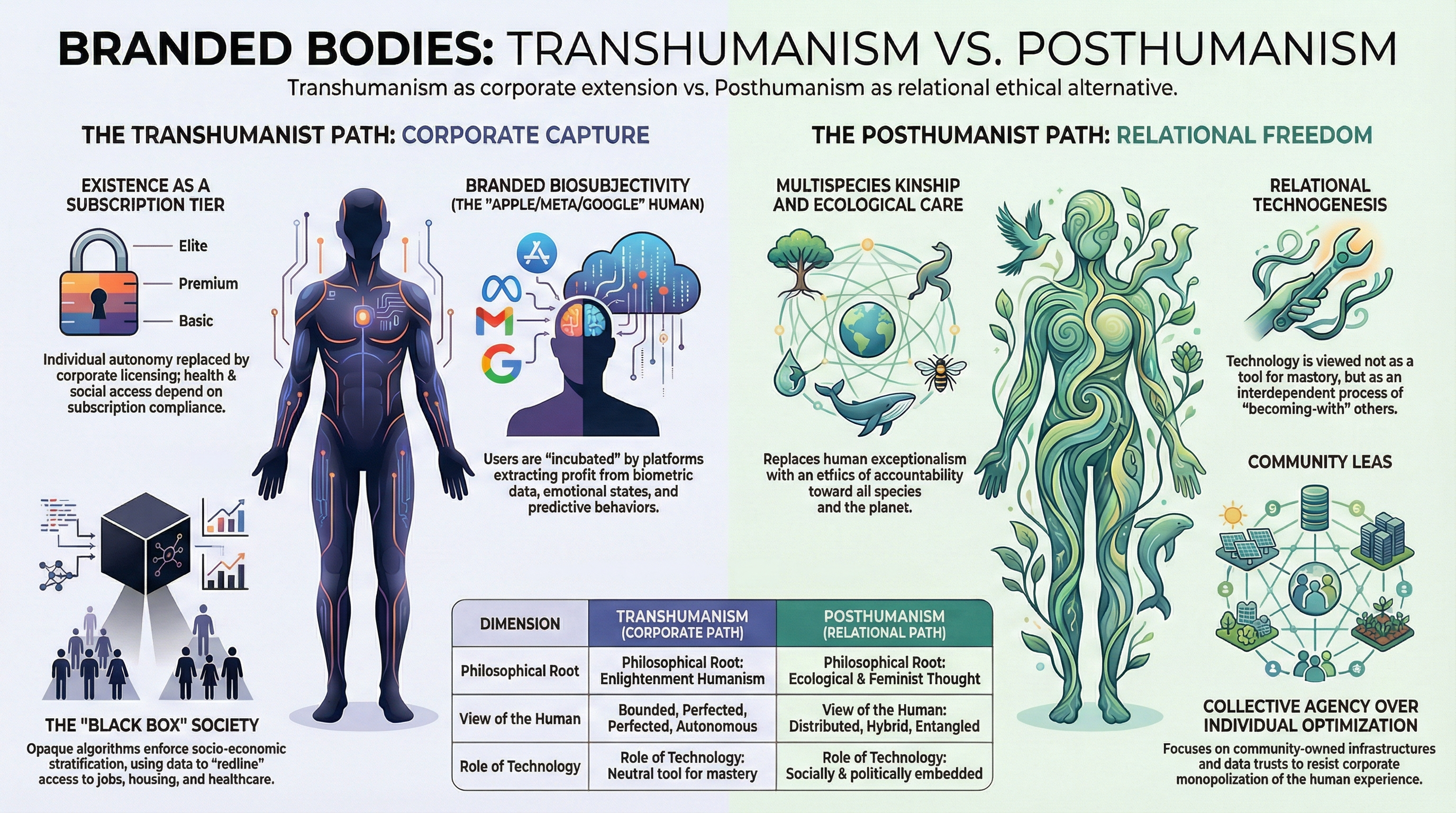 Another critical concern articulated by posthumanist scholars centers on how transhumanism conceptualizes technology as a neutral, controllable instrument serving human ambitions. This framing, however, glosses over the intricate entanglements between technology, politics, economics, and power structures; and, crucially, how technology in turn shapes human subjectivities and social relations.