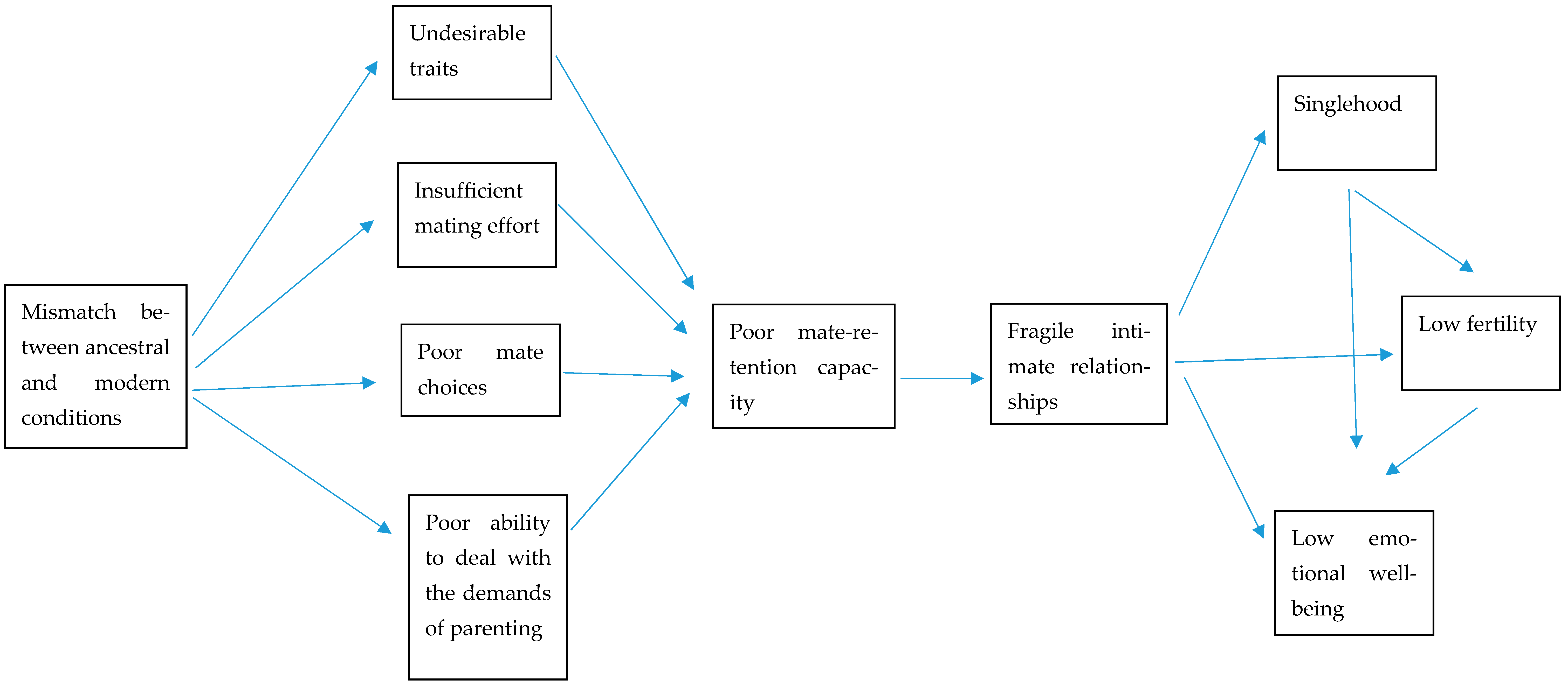 Figure 1. In the figure above, the mismatch between ancestral and modern conditions has negatively affected several mechanisms related to maintaining an intimate relationship, resulting in poor mate-retention capacity. In turn, this compromised capacity leads to fragile intimate relationships that result in singlehood, low fertility, and low emotional wellbeing.