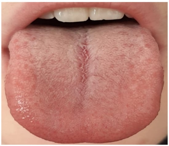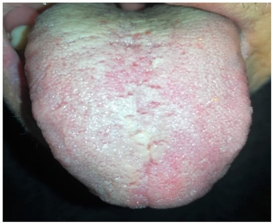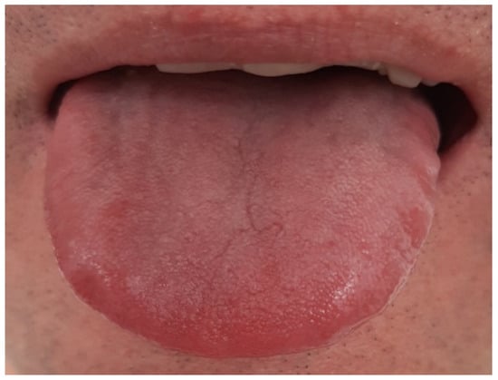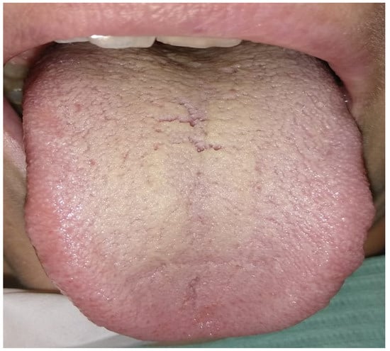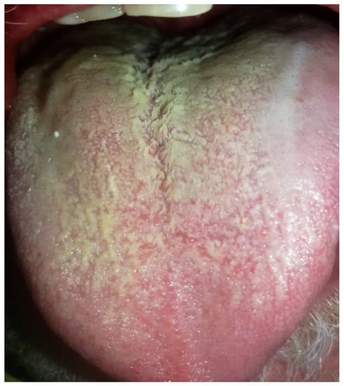 In accordance to Traditional Chinese Medicine, “A pathology arises associated to a tongue surface coating appearance. The surface coating represents the exterior manifestation, which corresponds to the sustaining disease, and is the primary indication for the diagnosis making”. In this way, the appropriate knowledge of the molecular aspects of tongue response is a key factor to comprehend this semeiotic medical practice [1,3,4]. Several studies on the microbiology of the healthy human tongue, through the sequencing of 16S rRNA, which is applied for the detection, categorization, and evaluation of the microbic charge within the biological mixtures, have shown that the most abundant phyla are Fusobacteria, Actinobacteria, Firmicutes, Proteobacteria, and Bacteroidetes [1,4,5]. The variation in the microbiota of the tongue lining recorded by metagenomic sequencing identifies potential biomarkers for several diseases, including the precancerous cascade [1,6,7]. The thin white or reddish tongue coating with 0/1 patina is a symbol of good health (Figure 1 and Figure 2), while the “white-fat” and “yellow-dense” coating (Figure 3 and Figure 4) may be an indication of inflammation, infection, and stress, as well as of immune and endocrine disorders (Figure 5) [8,9]. Thick coat and tongue moisture are increased in tumors. The relationships between tongue diagnosis and diseases, including rheumatoid arthritis, gastritis and precancerous lesions, liver, pancreatic, and lung cancer, were explored [1,10,11,12,13,14,15]. Tongue-lining microbiota biomarkers could provide a complement for the diagnosis of several diseases from the noninvasive, individualized, and long-term monitoring aspects [1,16]. Tongue diagnosis is a simple, noninvasive method of assessing physiological conditions by observing the thickness and color of the coating [6]. The tongue coating is categorized into three different classes in accordance to their color typologies: white coating (W), yellow coating (Y), and black and gray coating (Table 1). A yellow coat is considered an indication of water retention and heat [3]. The most common syndromes are the following four: external cold syndrome, internal cold syndrome, external heat syndrome, and internal heat syndrome, and are associated with thin white, thick white, thin yellow, and thick yellow tongue coatings [1]. Cold and hot syndromes are two contrary but internally related conditions [8]. According to the TCM theory, the tongue is an external extension of the spleen and stomach [17,18]. Western medicine refers to the indexes of the thickness of the coat on the back of the tongue, classifying it in four degrees [19] (Table 2).