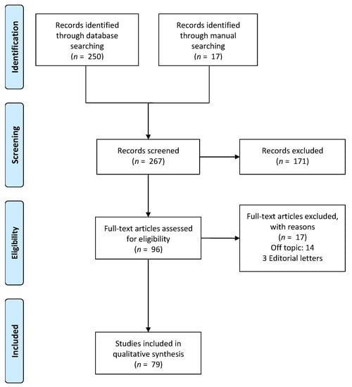 A total of 267 papers were retrieved from the manual and electronic databases. A total of 250 articles were examined, and a total of 96 were considered for the full text assessment. The eligibility procedure excluded a total of 17 papers, and 79 were considered for the qualitative review (Figure 7).