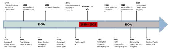 Over the past two centuries since its independence in 1847, Liberia has made significant progress in building an integrated public health system designed to serve its population. Despite a prolonged period of civil conflict (1990–2003) and the emergence of the 2014–2016 Ebola Virus Disease (EVD) that crippled its already weakened health system, Liberia was able to re-emerge, making significant strides and gains in rebuilding and strengthening its health infrastructure and systems. Lessons learnt from the EVD epidemic have led to developments such as the newly established National Public Health Institute of Liberia (NPHIL) and several tertiary public health institutions to meet the growing demands of a skilled workforce equipped to combat existing and emerging health problems and/crisis, including informing the more recent COVID-19 response. This article delineated and documented the historical efforts made towards establishing public health interventions such as infrastructures and systems of the past, and how these structures and systems became the foundation and pillars of the current resilient health system. This paper highlighted some of the key crises and interventions deployed, and some of the historical public health champions, laws, and policies that aided in strengthening the public health systems then and now. It is expected that in addition this paper can be used as a guide for further or future research.