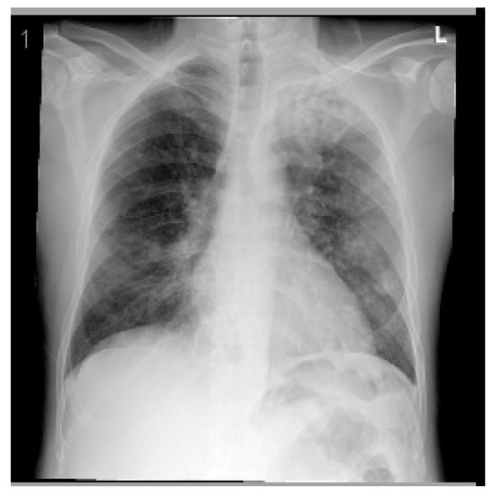 Posteroanterior chest X-ray (CXR) of the first case. The CXR shows bilateral diffuse patchy opacities noted with left upper lung zone consolidation, which could be infectious for clinical correlation and follow-up. Perihilar peribronchial thickening noted. No pleural effusion or pneumothorax. The cardiomediastinal silhouette appears unremarkable.