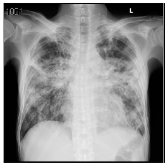 Posteroanterior chest X-ray (CXR) of the third case. The CXR shows diffuse bilateral reticular infiltration, mainly in the middle zones with bilateral apical cavitary lesions. The cardiac shadow and configuration are shaggy but generally show no abnormality, and the costophrenic angles are clear.