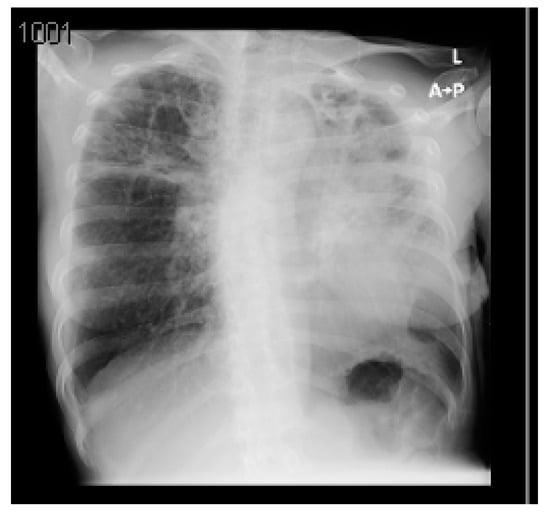 Upon examination, the patient was conscious, oriented, alert, and cachectic and looked in respiratory distress. Her vital signs were as follows: blood pressure was 104/77 mmHg, pulse was 78 bpm, respiratory rate was 16 breaths/minute, and temperature was 36.8 °C. Her initial oxygen saturation was 85% on room air. She was given oxygen through a face mask and switched to 4 L of oxygen through a nasal cannula to maintain her saturation above 95%. Her chest examination revealed crackles all over her left side and crackles on the right side up to one-third of her right lung. Her cardiovascular, abdominal and peripheral examinations were unremarkable.