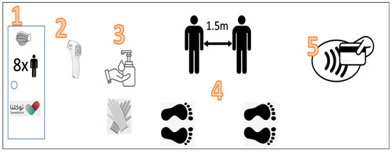 The current protective measures taken in closed spaces in Saudi Arabia. (1) The entry requirements to each place, which include stating the maximum number of people at one time, wearing a face mask, and having an active Tawakkalna application. (2) The mandatory temperature check upon entry through contactless means. (3) The provision of hand sanitizers and, if needed, disposable gloves like those available in supermarkets. (4) The strict social distancing rules of at least 1.5 m between building occupants are usually shown as floor markings. (5) The provision of contactless payment options at all vending points.