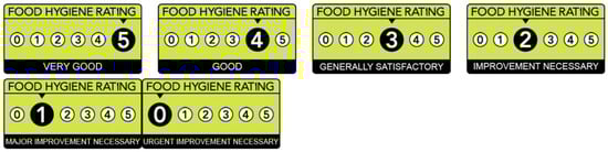 The level of compliance with the elements above determines the food hygiene rating. An establishment’s FHR depends on the food hygiene intervention rating following an inspection, partial inspection, or audit by a food safety officer []. However, rating systems show variation internationally, from symbols (smiley faces or starts), letter ratings (e.g., ‘A’, ‘B’), numerical scores, or statement cards (e.g., pass, closed) [].
