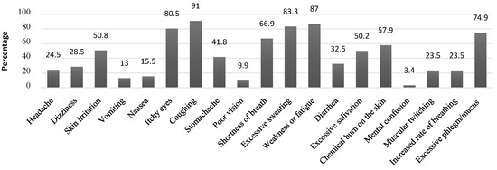 To understand common health symptoms experienced among the participants, a range of possible ill health symptoms were presented, and the participants were asked to identify those they could relate to either during or after handling and processing of e-waste products. From the results, 91% of the respondents reported experiencing a prolonged period of coughing in association with the recycling task. In addition, excessive sweating (83.3%); itchy eyes (80.5%); excess phlegm/mucus (74.9%); shortness of breath (66.9%); dizziness (28.5%); and headache (24.5%) were among the most common forms of ill health symptoms experienced among the participants (Figure 2).