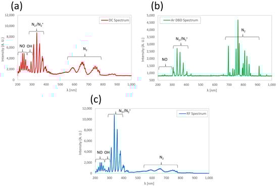 Optical emission spectra obtained with (a) DC, (b) DBD and (c) RF plasmas.