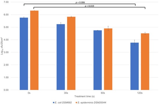To test the disinfection power of the DC plasma source, samples of E. coli DSM 682 or S. epidermidis DSM 20044 dried onto Petri dishes and exposed to 15 s, 30 s, and 45 s showed no effect while surface temperature levels remained around 45 °C. A series of qualitative trials was conducted on samples of E. coli DSM 682 or S. epidermidis DSM 20044 dried onto stainless steel and silicone disks. Decontamination experiments were carried out for 30 s, 60 s, 90 s, and 120 s. The results showed that CAP was able to reduce bacterial loads on stainless steel surfaces even after exposure with a duration as short as 30 s. Using a cutoff (α) for statistical significance of 0.05, it was observed that a statistically significant reduction was achieved on stainless steel disks, reaching a log10 1.99 (p = 0.006) reduction after 120 s for E. coli. For S. epiderminis, the reduction after 120 s was log10 1.81 (p = 0.019, Figure 3). However, ozone levels reached 0.5–0.6 ppm, which represents three times the tolerable limit value according to Swiss safety standards [24]. Additional ventilation of the surface treatment area diminished ozone levels to acceptable levels in further trials. Furthermore, temperature levels on the disks were in the vicinity of 60 °C, higher than the biological tolerance temperature of approximately 44 °C [25]. While the reduction in microorganisms was considered statistically significant, levels also did not approach the minimum 4 log10 reduction required by EN 13697:2015+A1:2019 [20].