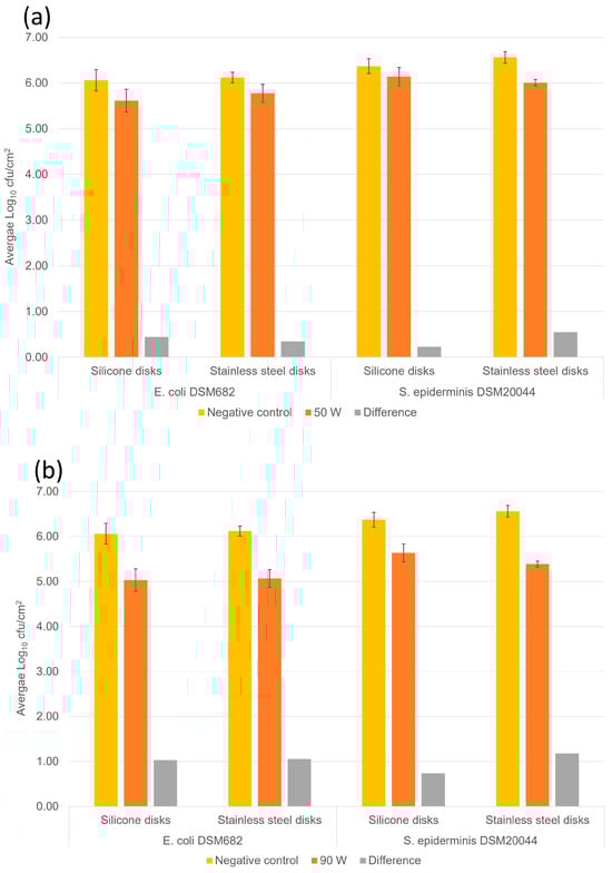 RF CAP disinfection (15.6 MHz) on stainless steel and artificial skin (silicone) for 75 s. The vertical scale is logarithmic (unit: log10 cfu/mL). Uncertainty bars indicate standard deviations. (a) RF power at 50 W and (b) RF power at 90 W (right).