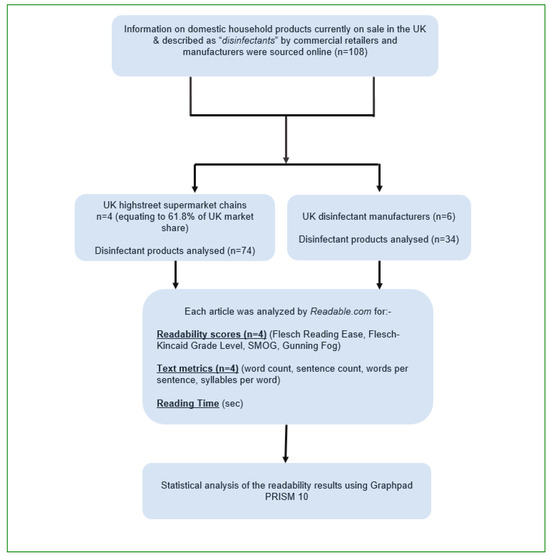 To date, there have been no reports describing the readability of domestic household disinfectant instructions. The aim of this study was therefore to examine the readability (Flesch Reading Ease, Flesch–Kinkaid Grade Level, Gunning Fog and SMOG scores; text metrics) of consumer-facing information with domestic household disinfectants sourced from (i) UK high street supermarkets and (ii) disinfectant manufacturers in order to establish: