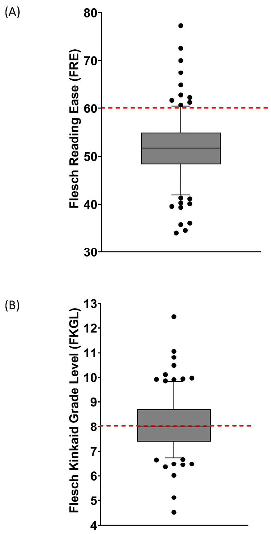 Box and whiskers plot comparing readability scores for (A) Flesch Reading Ease and (B) Flesch–Kinkaid Grade Level for total information sources examined (n = 108). Box represents 25th and 75th percentiles and bar represent the median. Whiskers represent the 10th and 90th percentiles and ● represents outliers outside these percentile ranges. The dashed red line represents the target readability score. For the Flesch Reading Ease, this is ≥60. For the Flesch–Kinkaid Grade Level, this is ≤8.