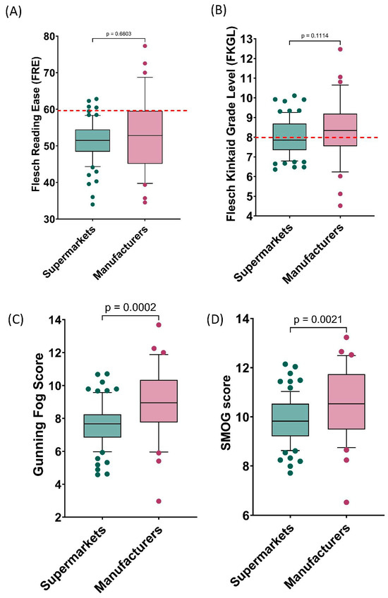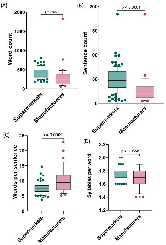Overall, when collectively considering the information provided by these two sources, reference readability scores were not achieved, as the mean Flesh Reading Ease score was 51.7 (target ≥ 60) and the Flesch Kinkaid Grade Level score was 8.1 (target ≤ 8) (Table 1). When evaluated as separate sources of information, there was no significant difference in the FRE and FKGL scores between supermarkets and manufacturers (Figure 3A,B). However, both the Gunning Fog and SMOG scores showed better readability for supermarket-provided information (p = 0.0002 and p = 0.0021, respectively) (Figure 3C,D). With regard to text metrics, supermarkets prepared information which was significantly longer in length in terms of word count and sentence count (p < 0.0001 and p < 0.0001) (Figure 4A,B). More importantly, supermarkets prepared materials which had significantly fewer words per sentence (p = 0.0009), which is crucial for improved readability (Figure 4C). The consequence of the longer word counts and sentence counts found for supermarket-provided information was a significantly longer reading time (p = 0.0311).