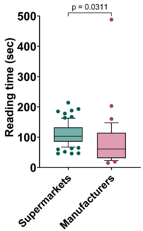 Box and whiskers plot comparing reading time (secs) for disinfectant information provided by (i) supermarkets (n = 74) and (ii) manufacturers (n = 34) on retail sale in the UK in September 2023. Box represents 25th and 75th percentiles and bar represent the median. Whiskers represent the 10th and 90th percentiles and ● represents outliers outside these percentile ranges. Statistical significance is shown, as calculated using an unpaired t test for data which had a normal distribution (parametric) and a Mann–Whitney test for data which had a non-normal distribution (non-parametric). A p value of <0.05 (5%) was considered as statistically significant.