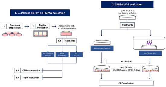 Past studies have reported that polymethyl methacrylate (PMMA), the most used polymeric denture base material, may present as a plaque or biofilm reservoir [7], which further causes infections either in the oral cavity, such as denture stomatitis, which is mainly caused by C. albicans [8], or even spread to other sites, such as in the case of aspiration pneumonia. Moreover, during the more recent COVID-19 pandemic, SARS-CoV-2 was also reported to exist in the dental biofilm of infected patients [9], and cross-infection in healthcare facility settings must be prevented [10]. The presence of both C. albicans and SARS-CoV-2 in denture wearers might increase morbidity and mortality, especially in older adults, pregnant women, and immunocompromised patients, where the microbiota composition and the host–immune response are altered [11,12,13].