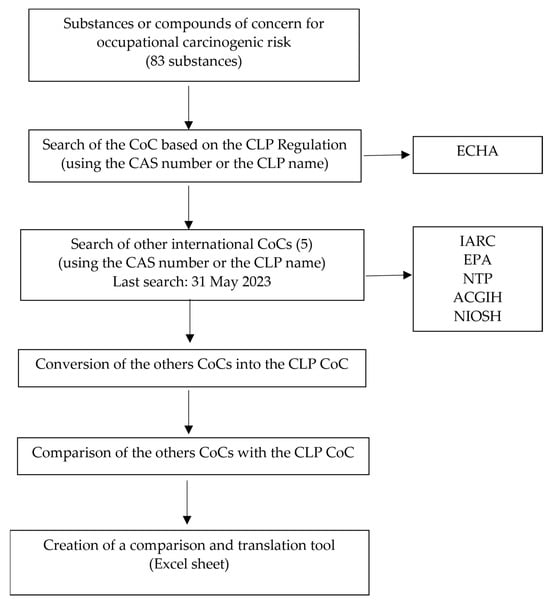 Substances and compounds of concern due to their occupational carcinogenic risk, that have been classified as carcinogens or suspected to be carcinogens based on the CLP Regulation, have been selected for the study. Two of the authors (C.Z. and A.S.) selected a list of chemical agents and their respective CLP CoC from the list of harmonized entries in Annex VI of CLP (18th Adaptation of Technical Progress which will come into effect in November 2023 [10]). The ECHA tool “Simple search for chemicals/regulated substances” [11] was consulted too. Once the CoC was defined according to CLP, the international CoCs by IARC [12], US EPA [13], US NTP—National Toxicology Program [14], ACGIH [15], and NIOSH—National Institute for Occupational Safety and Health [16] were obtained for the same chemical agents. Chemicals’ classifications were searched using their specific CAS number (Chemical Abstract Service Registry Number) or, if CAS numbers were not available for certain chemicals, using their CLP ECHA name. The last search was performed in May 2023.