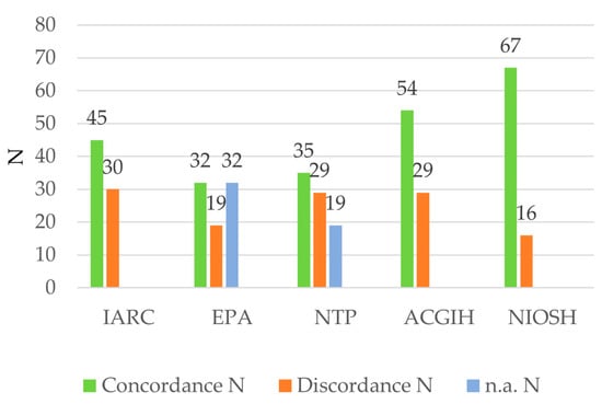 It is worth noting that, regarding the NIOSH classification, a “qualitative” carcinogenicity classification was attributed, based only on the presence or absence of the chemicals in the consulted list, as no other information on carcinogenicity level categorization is available. Therefore, the category “C” referring to the NIOSH CoC defines an “Occupational Carcinogen”. In addition, if the outcome of classification conversion resulted in an uncertain assignment between different classification categories (for example CLP categories 1B and 2) the classification was arbitrarily assigned to the most precautionary CLP category of the options considered (1B in this example). The concordance of the “converted CLP CoC” with the reference classification (“original CLP”) was verified. If the CLP CoC was not available (“n.a.”: not available; see Table S1—Supplementary Materials) for the selected chemicals, the IARC classification was considered as a primary reference for comparison with other classification systems. It is important to note that no new hazard assessments or new classifications of chemical agents were proposed or carried out in this study. Instead, the classification proposed by various sources consulted regarding the classification of carcinogenicity of selected chemicals was retrieved and used to apply a translation method, to favor an alignment of different classification systems according to a system chosen as a reference.
