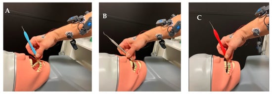 - Suedbeck, J.R.; Tolle, S.L.; McCombs, G.; Walker, M.L.; Russell, D. Effects of Instrument Handle Design on Dental Hygienists’ Forearm Muscle Activity during Scaling. J. Dent. Hyg. 2017, 91, 47–54. [Google Scholar] [PubMed]