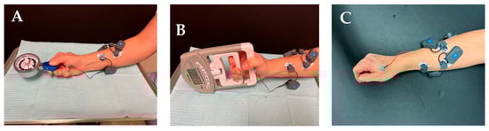 (A) Pinch; (B) Grasp; (C) Strength Dynamometers and Electrode Placement.