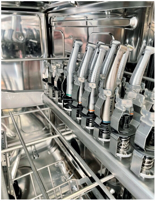 - Deasy, E.C.; Scott, T.A.; Swan, J.S.; O’Donnell, M.J.; Coleman, D.C. Effective cleaning and decontamination of the internal air and water channels, heads and head-gears of multiple contra-angle dental handpieces using an enzymatic detergent and automated washer-disinfection in a dental hospital setting. J. Hosp. Infect. 2022, 128, 80–88. [Google Scholar] [CrossRef] [PubMed]