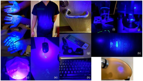 - Kundrapu, S.; Sunkesula, V.; Jury, L.A.; Sitzlar, B.M.; Donskey, C.J. Daily Disinfection of High-Touch Surfaces in Isolation Rooms to Reduce Contamination of Healthcare Workers’ Hands. Infect. Control Hosp. Epidemiol. 2012, 33, 1039–1042. [Google Scholar] [CrossRef]
