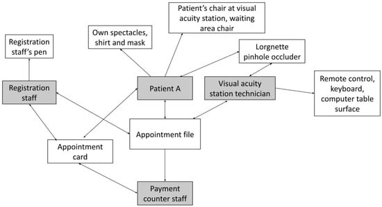 | Visual Acuity Station | 1. Patient A walks to the visual acuity station and passes the appointment file to the visual acuity station technician. 2. The technician hands a Lorgnette pinhole occluder to Patient A. 3. Patient A holds the Lorgnette pinhole occluder to the eyes and is assessed. 4. The technician uses a remote control to switch between different Snellen charts. 5. The technician takes the occluder back from Patient A without cleaning, uses the computer keyboard to type the findings and hands the appointment file back to Patient A. |