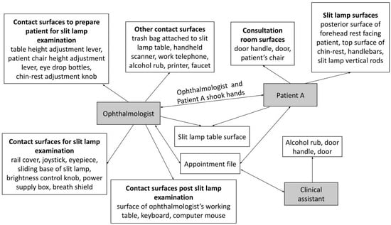 | Individuals whose hands were contaminated | 1. Patient A 2. Patient B 3. Registration staff 4. Consultation room clinical assistant | 5. Ophthalmologist 6. Visual acuity station technician 7. Payment counter staff |