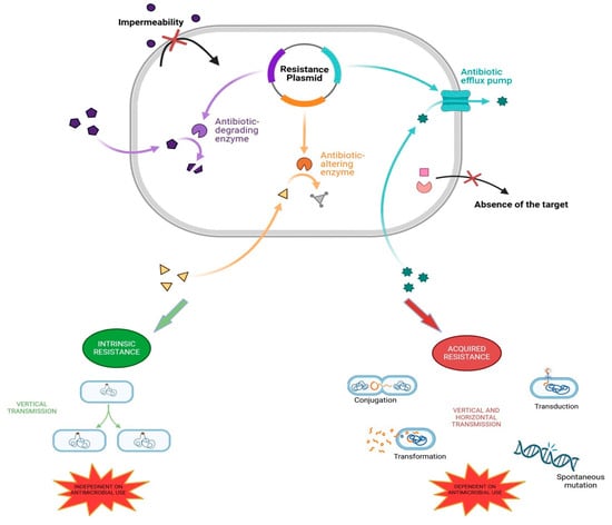 Bacteria are capable of evolving in response to external stimuli in order to ensure their continued existence. This in vivo process is underpinned by a number of key biological processes, including adaptation, reproduction and the spread of bacteria [26]. In the event that a bacterium is unable to proliferate due to the presence of an antibiotic, it may undergo genetic modifications that render it immune to the medication, thus allowing it to survive [27]. This phenomenon, which can be described as antibiotic resistance, represents the natural process whereby bacteria develop drug resistance. Consequently, antibiotic resistance can be defined as the capacity of bacteria to withstand the impact of an antibiotic to which they were previously susceptible, allowing them to survive and thrive [28]. AMR represents a fundamental and inevitable consequence of evolutionary processes whereby microorganisms develop genetic mutations to mitigate the lethal effect of antibiotics [29]. This phenomenon may be attributed to the ancient and continuously evolving mechanisms of resistance that are linked to the continuous competitive interaction between microorganisms for resources [30]. Environmental organisms that produce antibiotics (analogous to those currently employed in pharmaceuticals) as secondary metabolites have evolved a mechanism to protect themselves from the toxic effects of these molecules. Similarly, the microbial organisms that populate specific niches within the ecosystem must also undergo co-evolutionary processes in order to survive and compete for resources [31]. A wide range of studies have tested the existence of resistance genes in isolated caves, permafrost cores and other natural environments that have remained undisturbed by human activity. These studies have demonstrated that the presence of these resistance mechanisms pre-dates the introduction of antibiotics into clinical practice. A significant change since the introduction of antibiotics has been the notable increase in the selection of mobile resistance elements, which has consequently led to the proliferation of drug-resistant pathogenic and non-pathogenic bacteria [31,32]. Two distinct mechanisms of resistance have been observed in bacteria that allow them to withstand the effects of antibiotics, namely intrinsic and acquired resistance (Figure 1). The term “intrinsic resistance” (also known as “innate” or “natural” resistance) is used to describe the inherent or natural resistance of bacteria to antimicrobial agents [33]. The term “intrinsic resistance” is used to describe a characteristic that is inherent to a bacterial species and is not influenced by prior antibiotic exposure or the genetic resistance reservoir in other species [34]. Gram-negative bacteria have an outer membrane that acts as a barrier to antibiotics [35]. Proteus spp., Morganella morganii, Pseudomonas mallei, Chromobacterium spp., Burkholderia cepacia and Serratia marcescens are all naturally resistant to colistin due to the constitutively expression of the arnBCADTEF operon and eptB gene, which results in surface modifications of the outer membrane lipopolysaccharide structure and its reduced affinity for the drug [36]. Acquired resistance mechanisms are based on chromosomal mutations or the acquisition of mobile resistance genes, which enable bacteria to obtain the ability to resist the activity of a particular antimicrobial agent to which they were previously susceptible [34]. Acquired resistance is a consequence of the evolutionary process whereby microorganisms adapt to the presence of antibiotics. This adaptation occurs through a number of mechanisms that are associated with the presence of mobile genetic elements such as plasmids, transposons and other mobile elements, capable of transmitting horizontally between bacteria [34]. The phenomenon of horizontal gene transfer (HGT) has emerged as a key driver in the rapid acquisition and dissemination of antibiotic resistance genes among bacteria. HGT refers to the non-inherited acquisition of novel DNA sequences, which enables the rapid generation of novel phenotypes, including those conferring antibiotic resistance. This process is mediated by three main mechanisms: transformation, conjugation and transduction. Conjugative plasmids, in particular, have a broad host range and are capable of transferring antibiotic resistance genes (ARGs) between different genera, orders and phyla, thereby contributing to the wider spread of resistance genes [37]. Plasmid-mediated horizontal gene transfer (HGT) is a common occurrence in environments with a high bacterial load, including soil, wastewater treatment plants and the gut microbiomes of humans and animals [38]. This approach would permit the mobilisation of reservoirs of ARGs from commensal or environmental bacteria to pathogenic ones and vice versa, as well as the acquisition and dissemination of AMR genes within and between bacteria from the human, animal and environmental sectors [39]. The aforementioned mechanisms encompass enzymatic inactivation, a reduction in cellular accumulation of the agent in question and the modification of cellular targets. The activation of these mechanisms is contingent upon the presence of mobile genetic elements, which include plasmids, transposons and other mobile genetic elements. A variety of cases of acquired antibiotic resistance have been observed, including methicillin-resistant Staphylococcus aureus (MRSA) and trimethoprim-resistant Haemophilus influenzae. Despite antibiotic treatment, bacterial infections frequently persist within the host. This persistence represents a significant medical concern, as it contributes to the overuse of antibiotics and the emergence of antimicrobial resistance. In recent years, there has been a growing recognition of the role of antibiotic-tolerant persister cells. Such cells are frequently growth-arrested and display reduced metabolism; however, they are capable of r