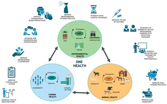 The challenge of antimicrobial resistance in the concept of One Health. The above schematic representation depicts the emergence, selection and dissemination of AMR within and between each of the “One Health” sectors (human–environment–animal), together with the multisectoral policies that should be implemented to prevent and reduce the health effects of AMR.