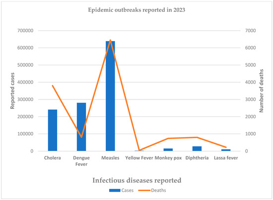 Figure 1. The most reported epidemic outbreaks in Africa as of December 2023. Data extracted from Africa Centre for Disease Control and Prevention, Africa CDC Epidemic Intelligence Report, 29 March 2024 [5].