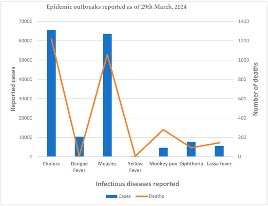 Figure 2. The most reported epidemic outbreaks in Africa as of March 2024. Data extracted from Africa Centre for Disease Control and Prevention, Epidemic Intelligence Report, 29 March 2024 [5].