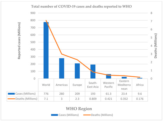 COVID-19 also constitutes an infectious disease outbreak that has plagued Africa in recent times. The COVID-19 pandemic caused by Severe Acute Respiratory Syndrome Coronavirus 2 (SARS-CoV-2) is considered a major global health threat of the 21st century. The disease was first reported in Wuhan city of Hubei province in China in December 2019 [16] and was declared a pandemic on 11 March 2020 by the World Health Organization [17] because of its global spread and fatality. As of 7 July 2024, 775,673,955 COVID-19 cases and 7,053,524 deaths (Figure 3) have been reported globally, with most fatalities occurring in the USA, Brazil, and India [18]. In the African region, a total of 12,381,836 COVID-19 cases and 259,265 deaths have been reported by the 55 African Union member states as of 28 March 2024 [5]. The COVID-19 pandemic had a devastating social, psychological, and economic impact on the global economy [19]. Unfortunately, the African populations suffered from most of the economic consequences and social and psychological impacts of the COVID-19 pandemic. For instance, it was estimated that the African region lost between USD 37 and USD 79 billion during the COVID-19 pandemic due to the lockdown directive resulting in a reduction in agricultural production, weakening of supply chains, increasing trade deficit, increasing unemployment, and massive job losses [20,21].