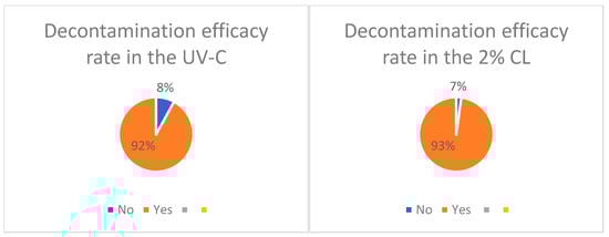 Decontamination efficacy rate in the UV-C and 2% CL Groups in the prosthetic abutments. (No 8% and Yes 92% for UV group; No 7% and Yes 93% for CL group).