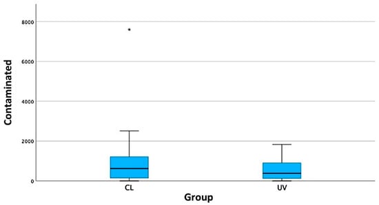Comparison between the number of contaminated CFUs between the UV-C and 2% CL groups.